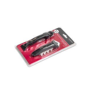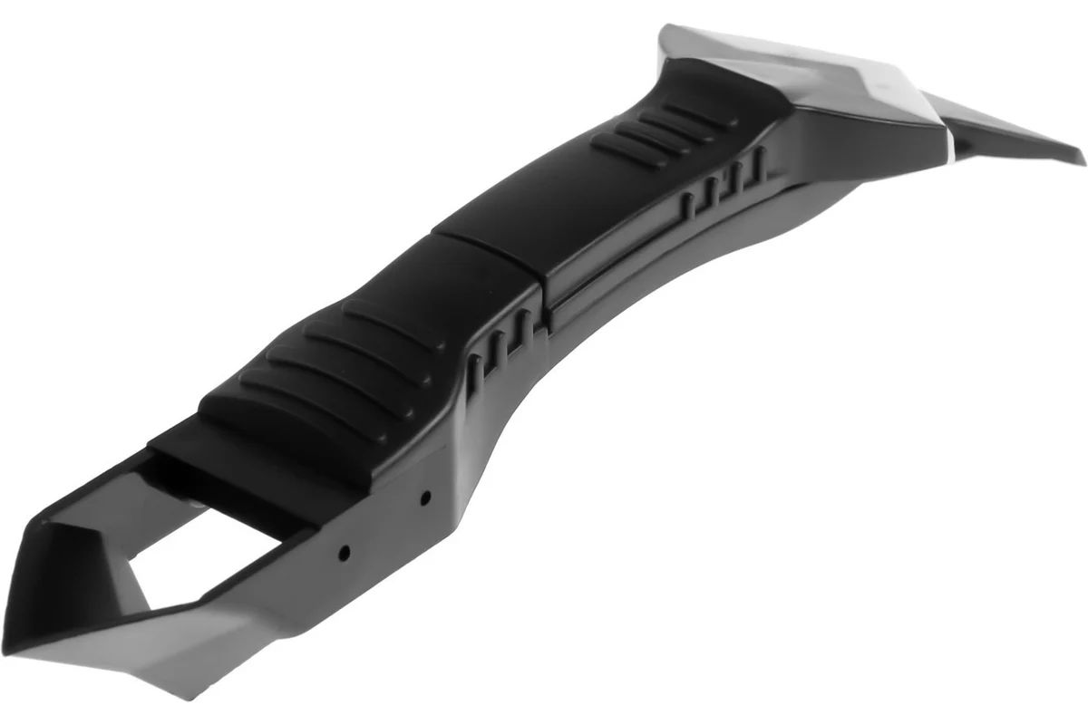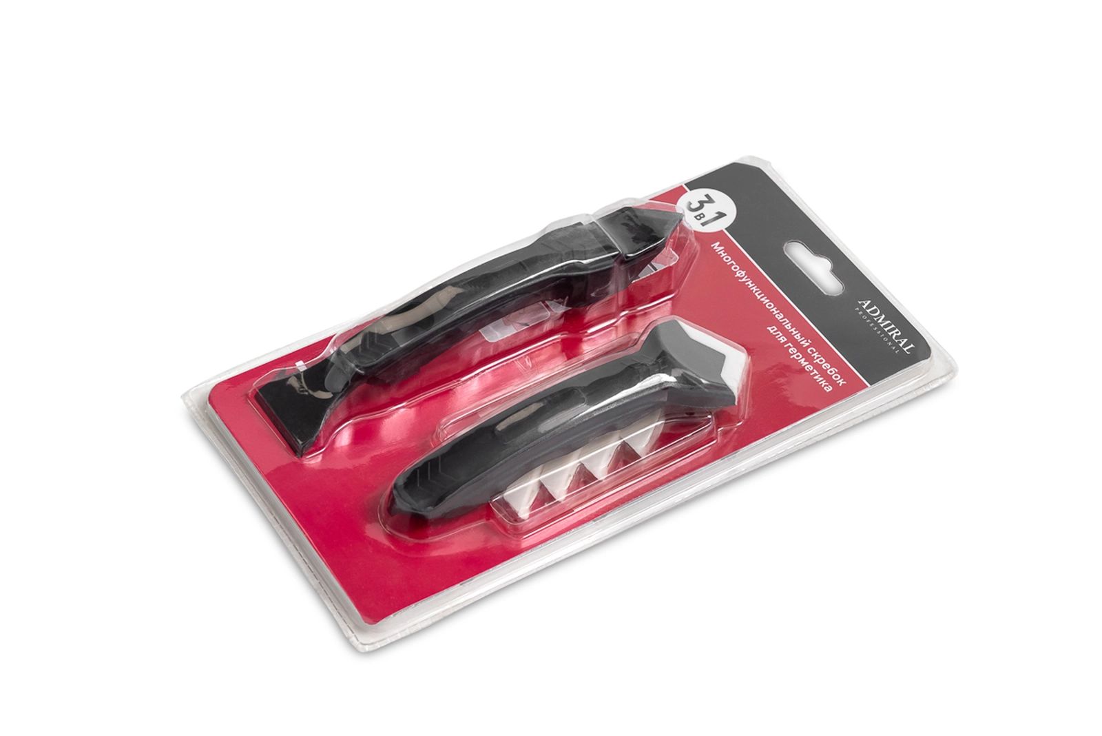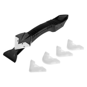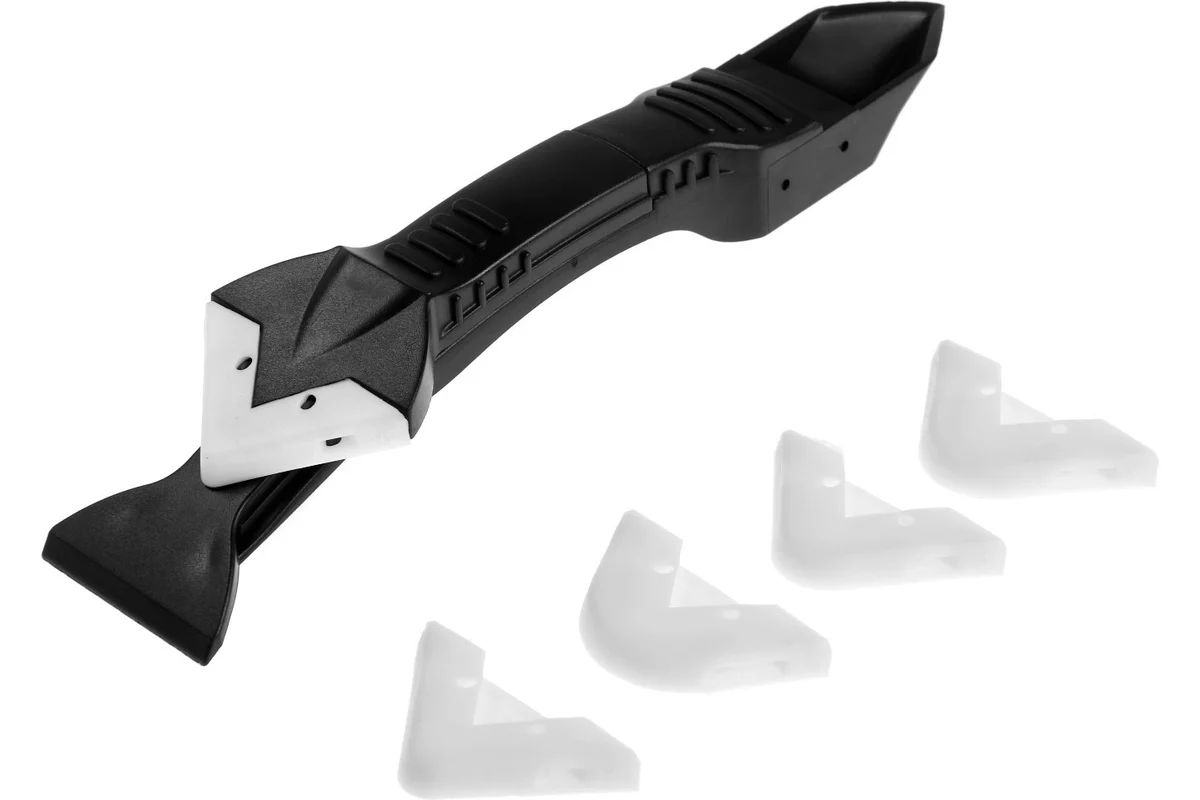 Модель является многофункциональной и удобной в использовании. С одного конца находится скребок, с помощью которого можно удалить лишний герметик из швов. На обратной стороне расположен выдвижной шпатель, который поможет в очистке поверхности от лишнего герметика. Комплект изготовлен из пластика, устойчивого к прилипанию герметика, легко моется и очищается от загрязнений.