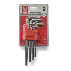 Набор из 9 предметов, из стали Cr-V, с термообработкой 48-52 HRC, хромированные. Предназначены для работы с крепежом, оснащенным внутренним шестигранным гнездом. При работе в труднодоступных местах удлиненный конец используется как рабочий. Набор стандартных шестигранных ключей.