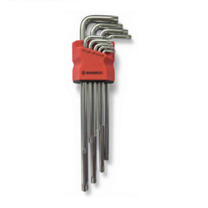 Ключи Torx длинные T10-T50, набор из 9 предметов из стали CrV с термообработкой 48-52HRC, хромированные. Предназначены для работы с крепежом, оснащенным шлицем Torx, в том числе антивандальным Torx Tamper Resistant со штифтом в центре головки винта.