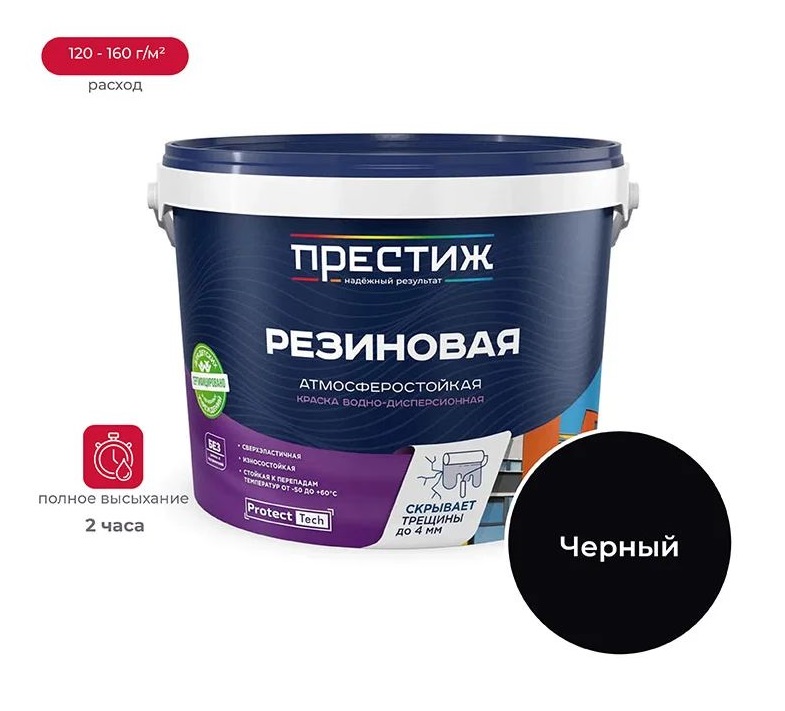 Резиновая краска ПРЕСТИЖ (черная, 2.4 кг) — это универсальный состав, образующий эластичное матовое покрытие, устойчивое к растрескиванию и перепадам температур. Для окрашивания бетона, кирпича, гипсокартона, штукатурки, дерева, ДВП и ДСП, пластмасс, металла, черепицы, оцинкованной стали, профнастила, шифера, ондулина.