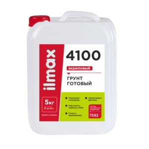 - ilmax 4100 – готовый к применению грунт на основе дисперсии акрилового сополимера проникает в основание, обеспыливая и упрочняя его. После обработки поверхности грунтом снижается водопоглощение, тем самым предотвращается быстрое высыхание наносимых в дальнейшем материалов и обеспечивается их равномерный набор прочности.