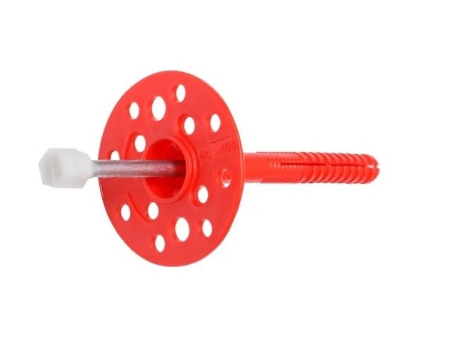 - Термоголовка (термозаглушка): пластиковый наконечник на металлическом стержне. Она устраняет «мостик холода» (металл не промерзает сквозь дюбель), защищает гвоздь от коррозии и предотвращает появление ржавых пятен на финишной отделке фасада.