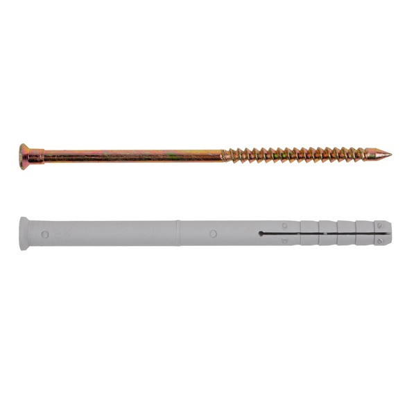 - Конструкция: Состоит из распорного полипропиленового дюбеля и стального оцинкованного гвоздя-шурупа.