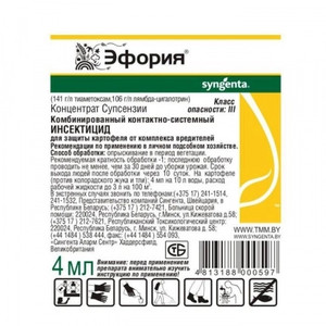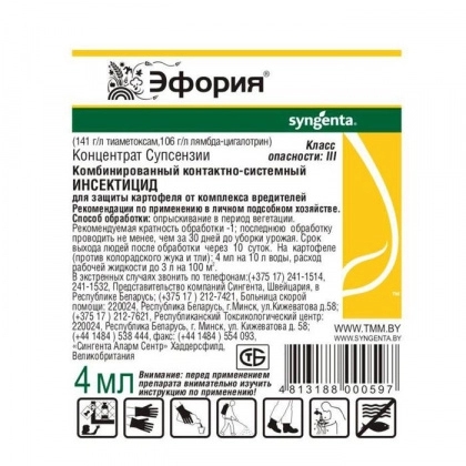 - Действующие вещества: тиаметоксам (141 г/л) и лямбда-цигалотрин (106 г/л).